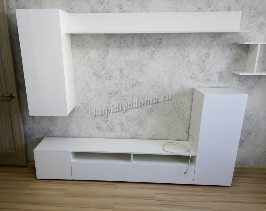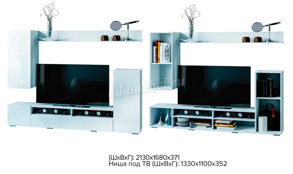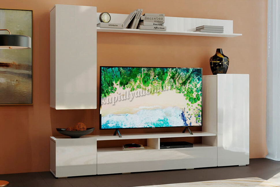 Гостиная Диамант – идеальное решение для гостиной в современном стиле. Сдержанный дизайн позволит воплотить любую задумку в интерьере. Её конструкция совмещает в себе все современные тренды: белый глянец, скругленные фасады МДФ, отсутствие лицевой фурнитуры. Декоративная панель с открытыми полками дает возможность не только сделать телевизор стильным предметом интерьера, но и расставить