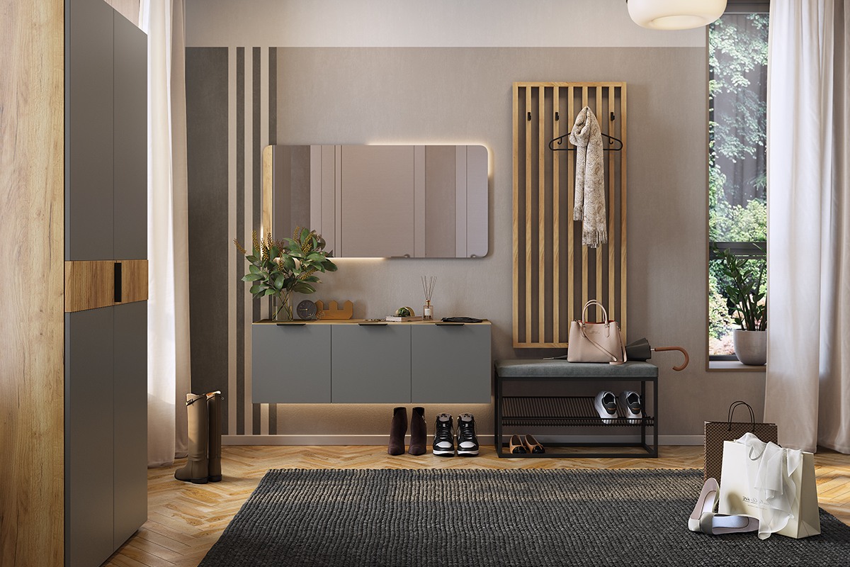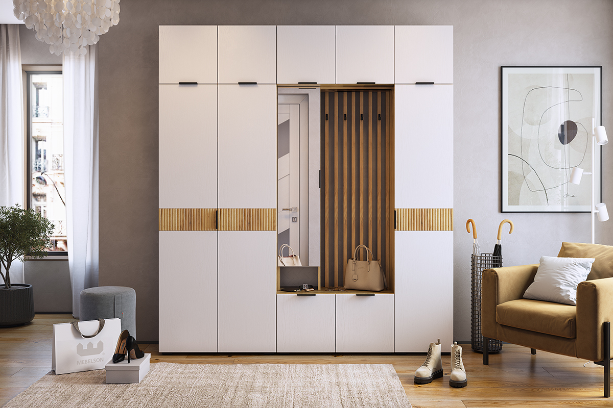 Стильные, трендовые рейки МДФ, акцентные крючки, зеркало, в котором можно себя увидеть в полный рост, полки для мелочей и головных уборов, а так же внизу большой шкаф для обуви, самые актуальные и ценные моменты в прихожей. Прихожая "Бери" можно поставить, как самостоятельное изделие или дополнить шкафами и антресолями из серии "Бери".