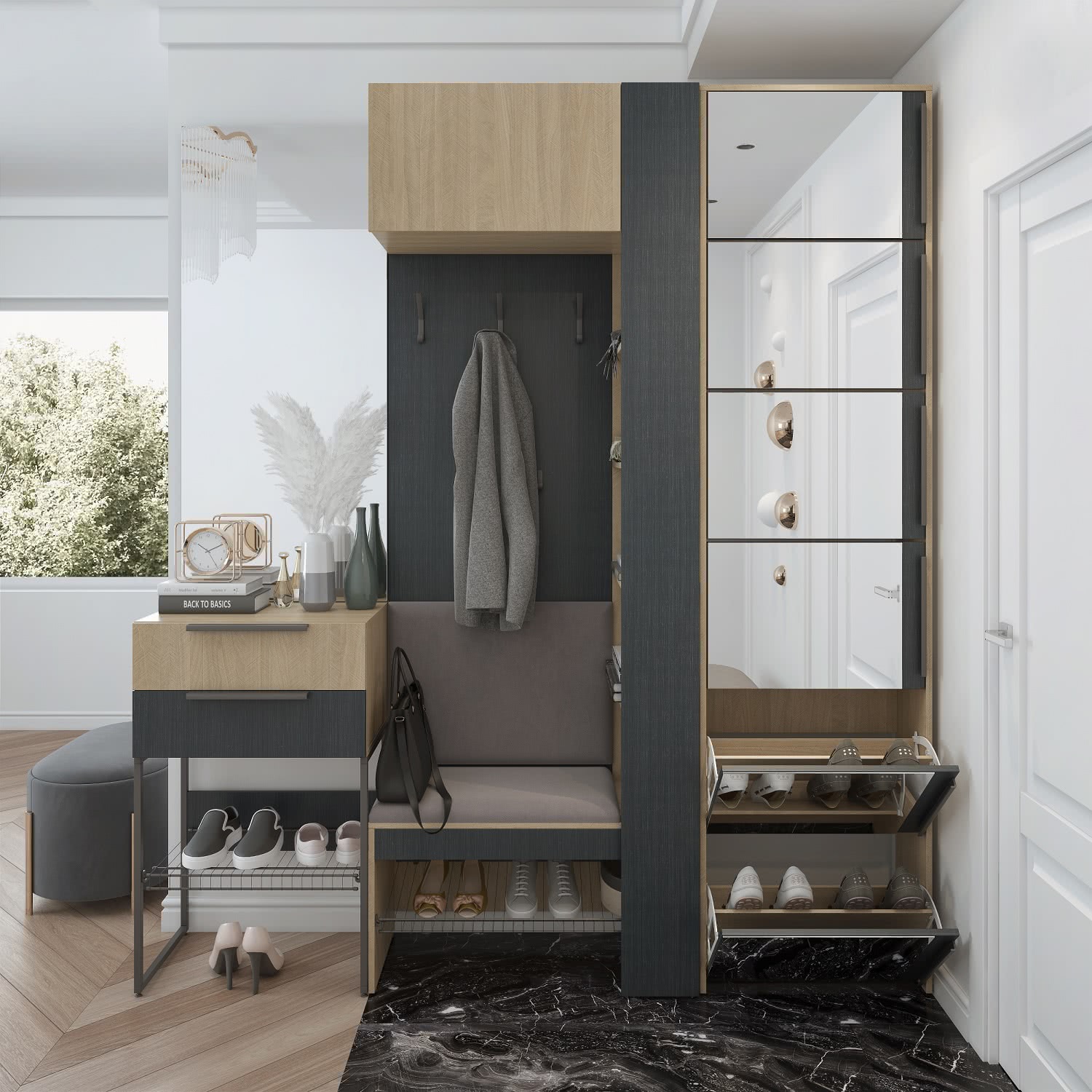 Прихожая «ПАЛЕРМО» – это новая модульная серия производства мебельной фабрики «Алисия». Выполнена в сочетании уже знакомого декора «Палермо» и нового декора «Рейн Морион», который имеет антрацитовый оттенок с металлическим отблеском и глубоким тиснением «Ферро» на поверхности ЛДСП и кромки. Декор «Рейн Морион» создан в стиле Хай-тек, такой же элегантный и холодный.