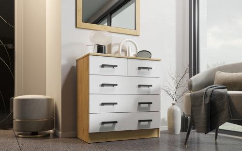 Комод оснащён пятью выдвижными ящиками (3 больших и 2 маленьких).