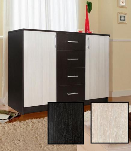 Комод имеет два больших отделения за распашными дверцами, разделенные внутри на 2 просторные полки. Посередине модели расположены четыре выдвижных ящика для разных мелочей. Дверцы открываются в сторону. Ящики выдвигаются на себя.