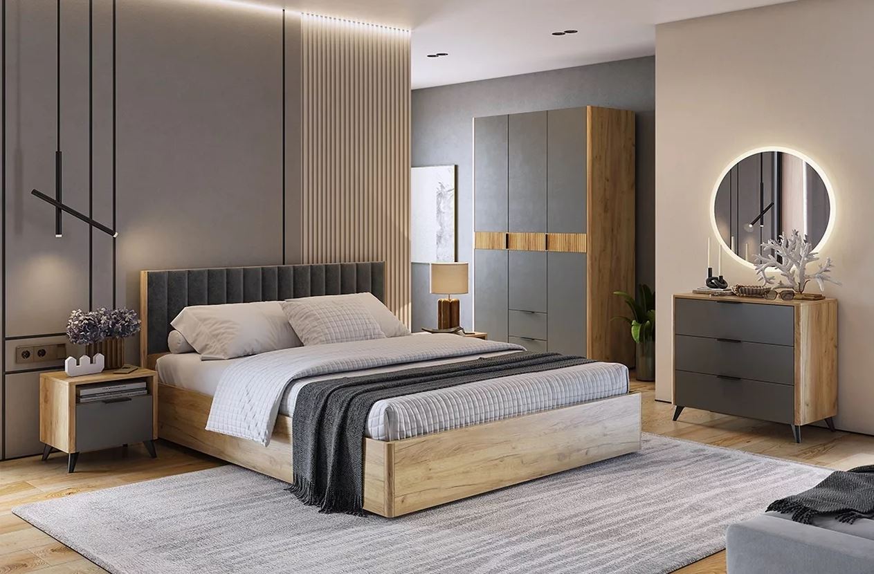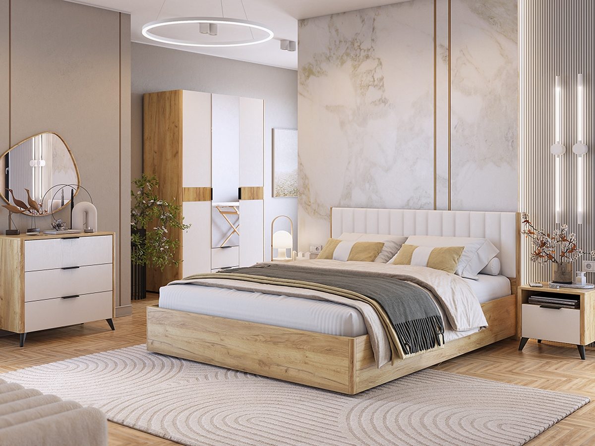 Спальный гарнитур Адам наполнит интерьер уютными оттенками и стильными деталями. Полукруглые профили на торцах сглаживают углы, делая мебель более безопасной и комфортной. Благодаря высоким ножкам в комнате легко проводить уборку, а на мягкое изголовье приятно опереться во время отдыха.