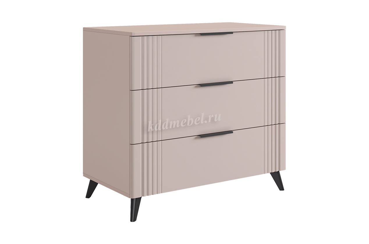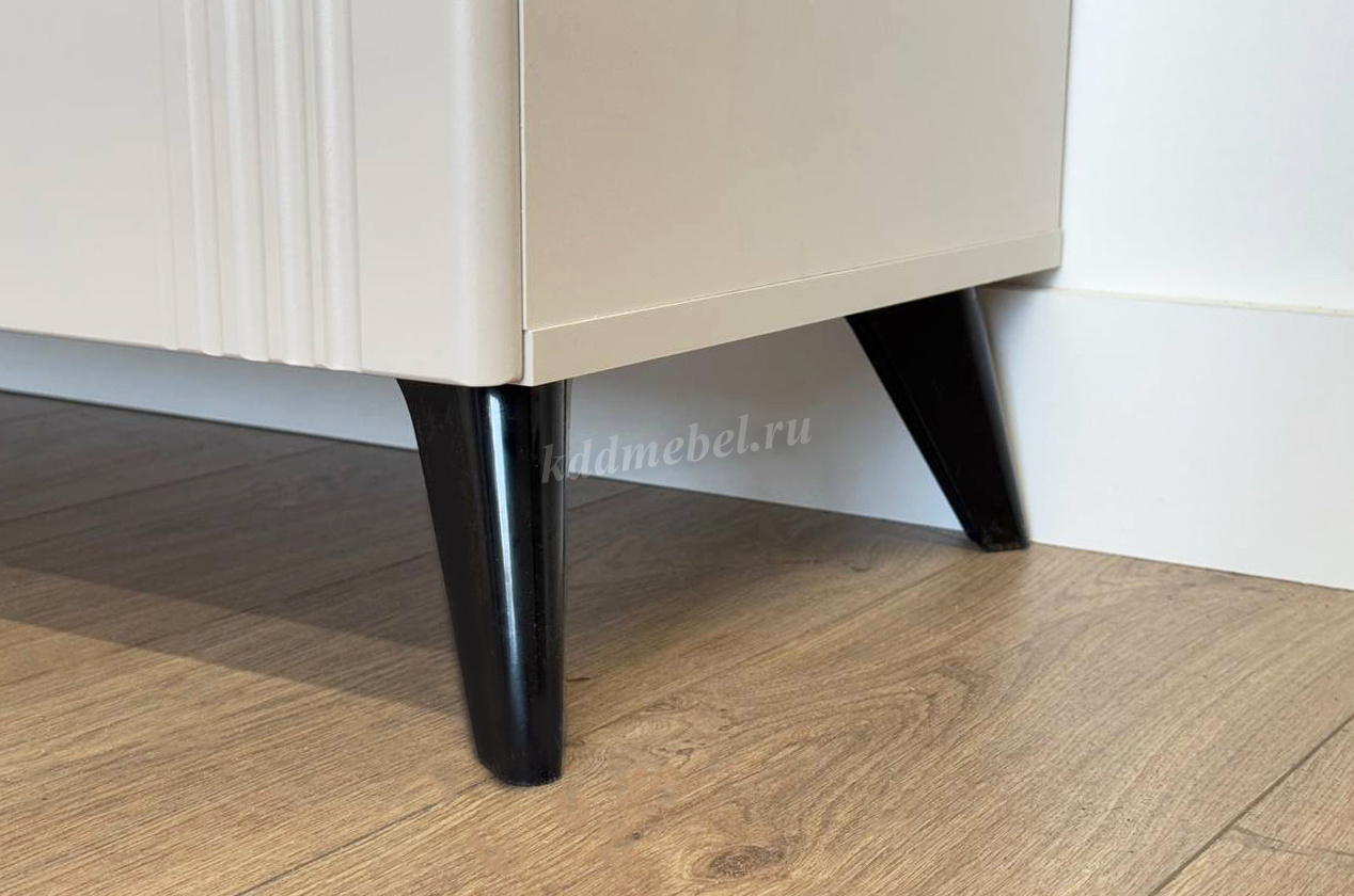 Комод изготовлен из качественных материалов: корпус выполнен из ЛДСП, что гарантирует прочность и долговечность, а фасад, выполненный из МДФ в плёнке ПВХ, не только выглядит эстетично, но и защищает комод от повреждений. Особое внимание заслуживает фрезеровка фасадов, которая придаёт изделию изысканный вид.