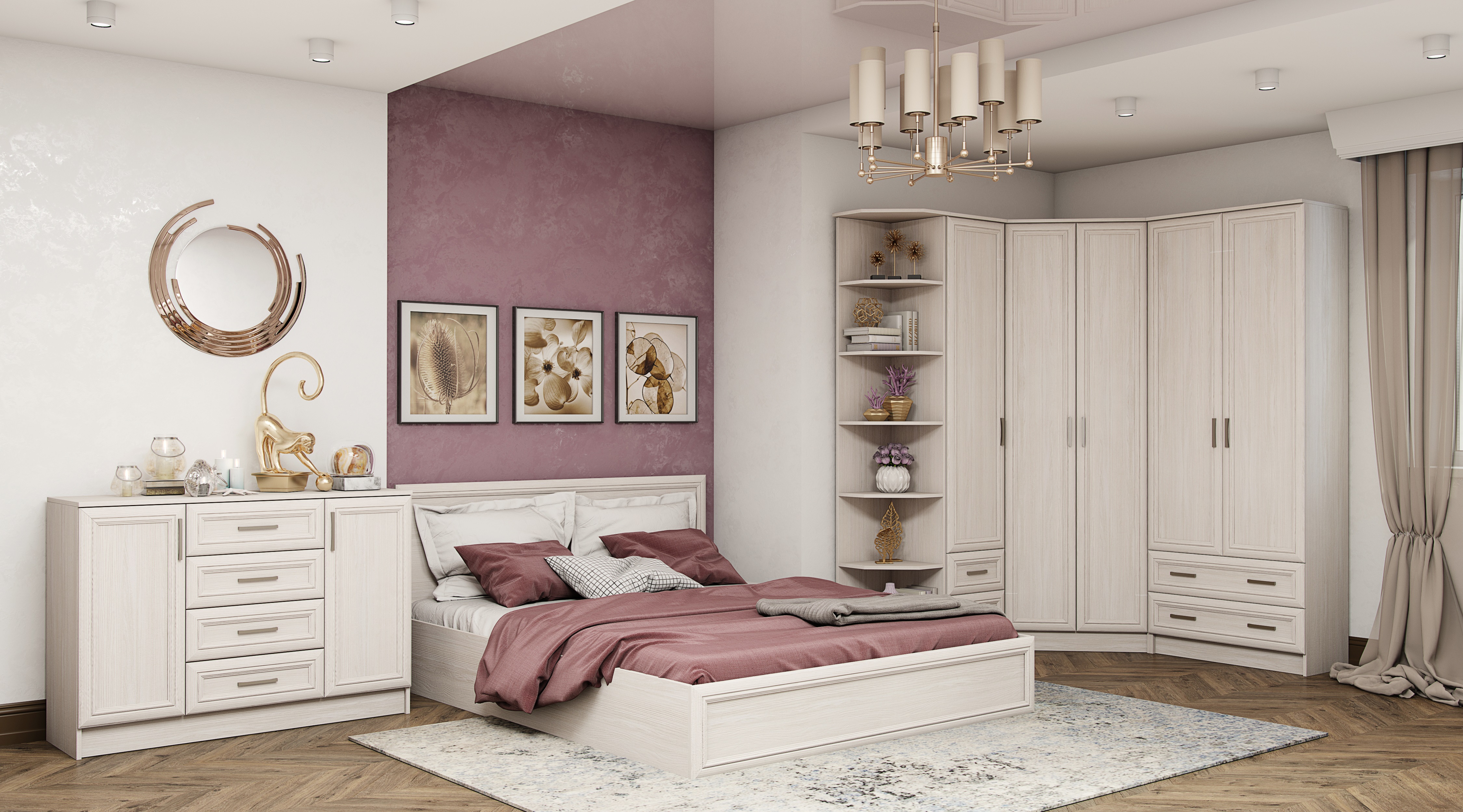 Модульная спальня Принцесса, позволяет подобрать мебельный гарнитур в помещение любых размеров и конфигураций. Материал корпуса ЛДСП 16 мм. Фасады ЛДСП по периметру оформленные декоративной рамкой МДФ. Набор мебели Принцесса исполнен в одной стилистике, благодаря чему смотрится очень гармонично.