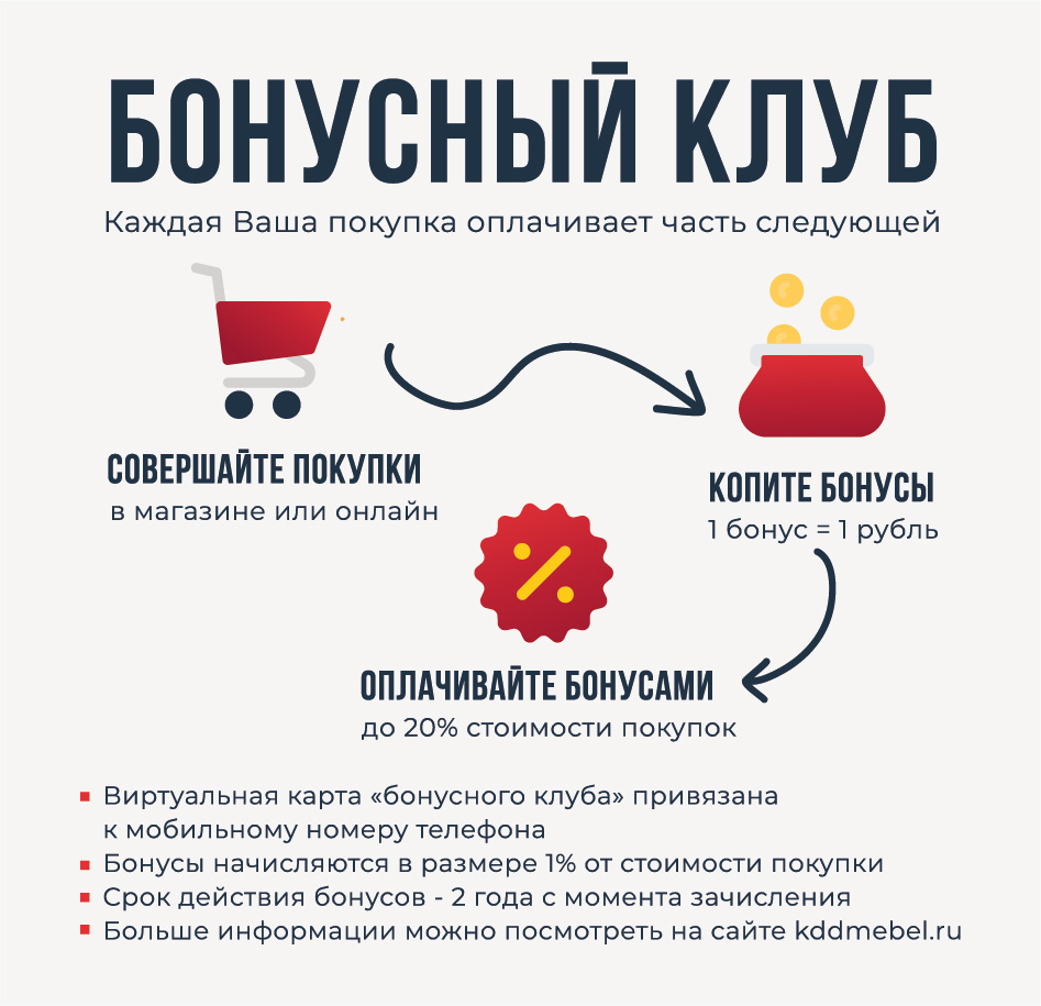 · Бонусы начисляются на следующий день после оплаты товара, в размере 1% от суммы покупки. 1 бонус равен 1 рублю.